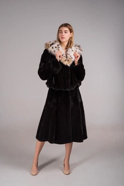 Оригинальный покрой шубки, имитирущий короткую норковую курточку и юбку из стриженого меха, позволит выглядеть нестандартно, а роскошный капюшон из канадской рыси придаст Вашему образу яркость.