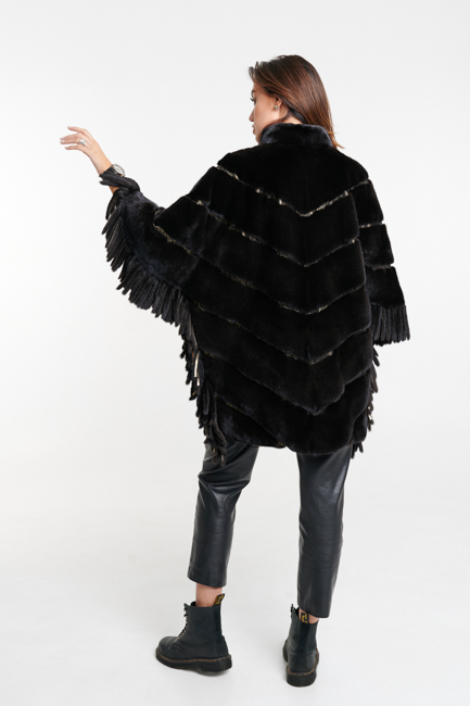 Воротник стойка, рукав укороченный «летучая мышь», отделка в виде бахромы из меха норки