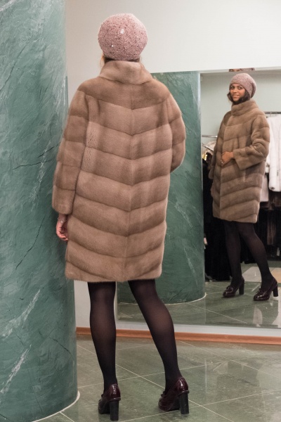 Популярная модель норковой шубки- поперечная диагональная.Это выгодно отличает ее от обычной шубы,так как она прекрасно держит форму и выглядит более стильно и роскошно.Пастельный бежевый оттенок подчеркивает натуральность меха.