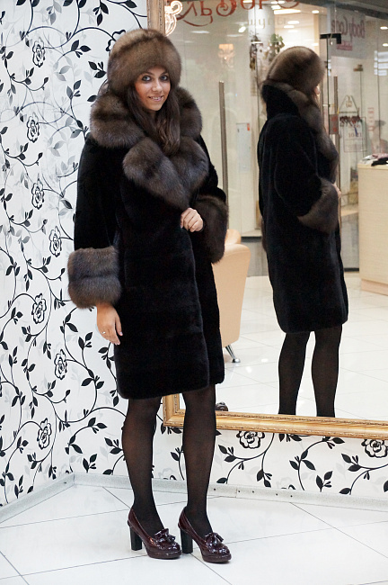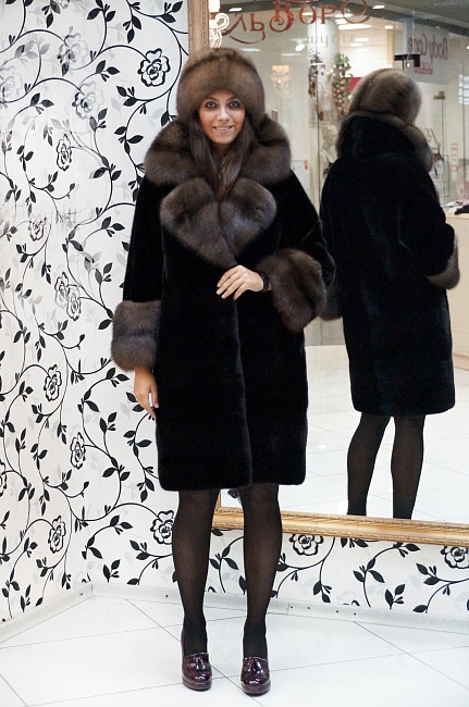 Потрясающее пальто из скандинавской норки создано специально для уверенных в себе, успешных и респектабельных женщин. Английский воротник и широкие манжеты на рукавах выполнены из восхитительного пушистого меха соболя, что придает этой модели оттенок аристократизма и благородства.