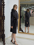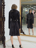 Пальто из астрагана с отложным воротником из меха енота, рукав втачной, силуэт приталенный.