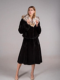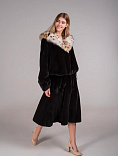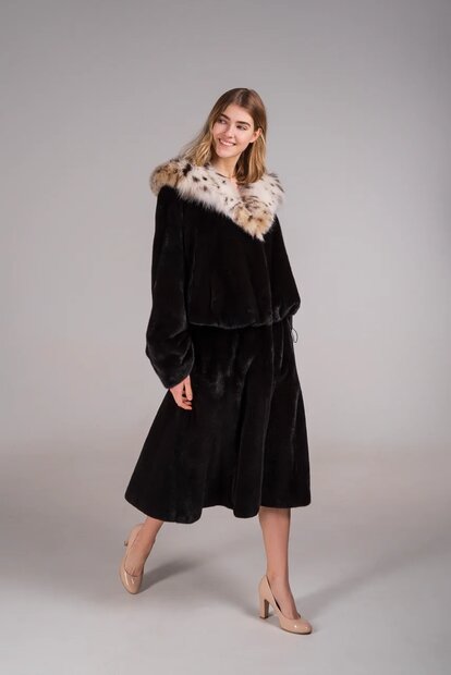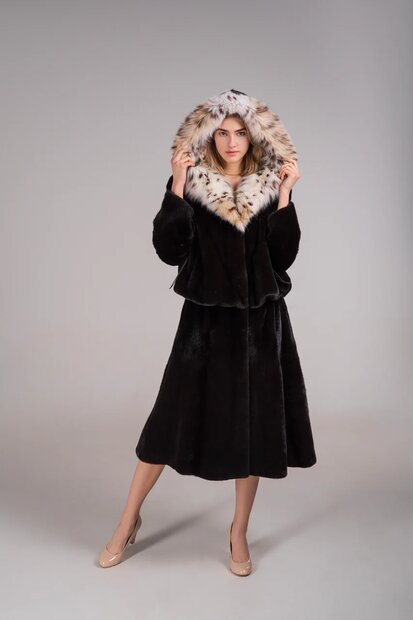 Оригинальный покрой шубки, имитирущий короткую норковую курточку и юбку из стриженого меха, позволит выглядеть нестандартно, а роскошный капюшон из канадской рыси придаст Вашему образу яркость.