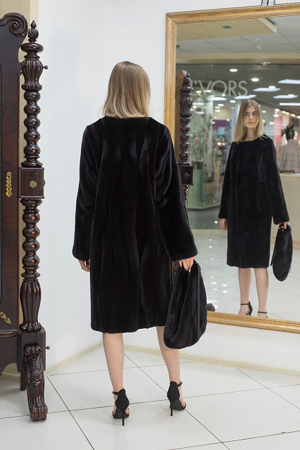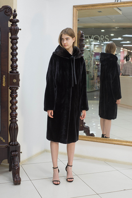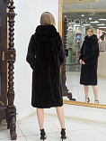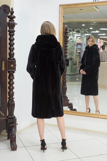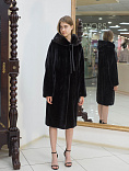 Лаконичный крой этого пальто из роскошной канадской норки оттеняет эксцентричная дизайнерская находка - волнообразные вставки из стриженного меха на спинке, а съемный капюшон делает эту модель более функциональной.