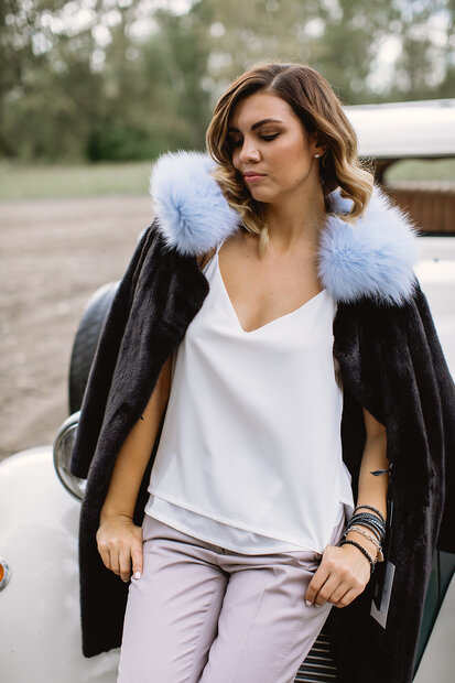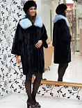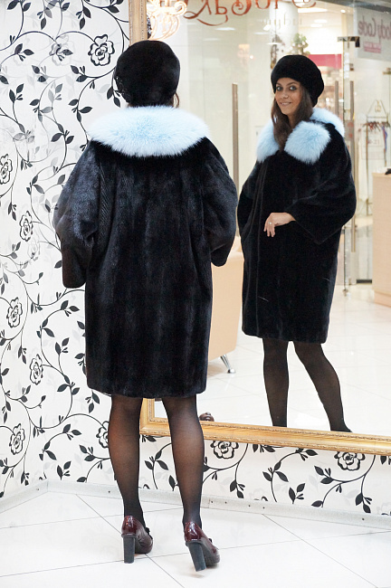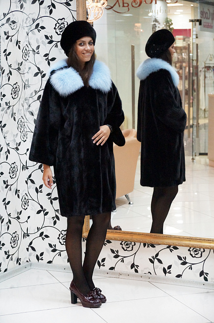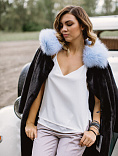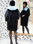 Настоящая модница по достоинству оценит шубку прямого силуэта из канадской норки BLACK NAFA. Свежее решение - съемный воротничок из песца нежно-голубого цвета. Контраст цвета, длины ворса подчеркнет Вашу индивидуальность.