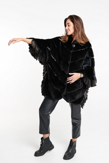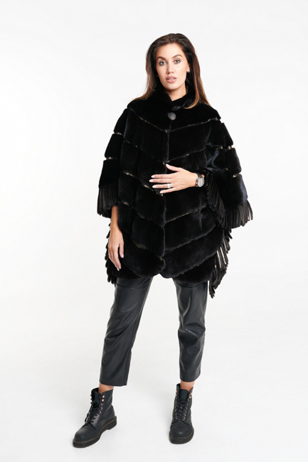 Воротник стойка, рукав укороченный «летучая мышь», отделка в виде бахромы из меха норки