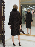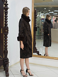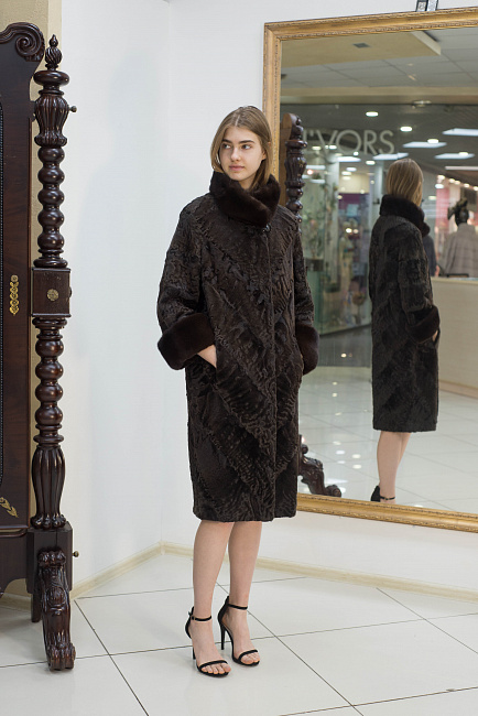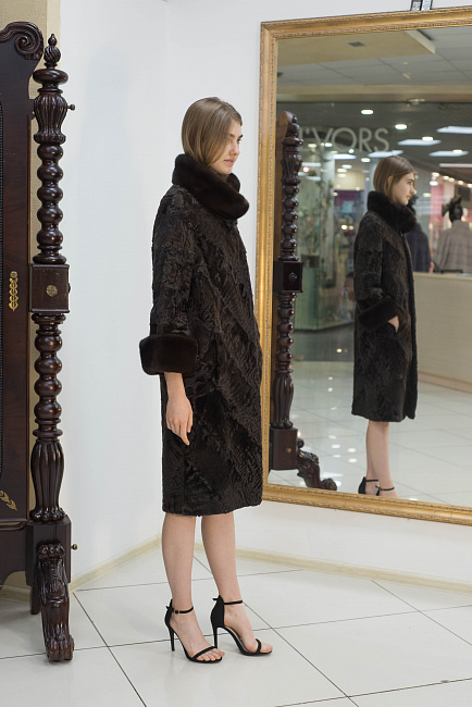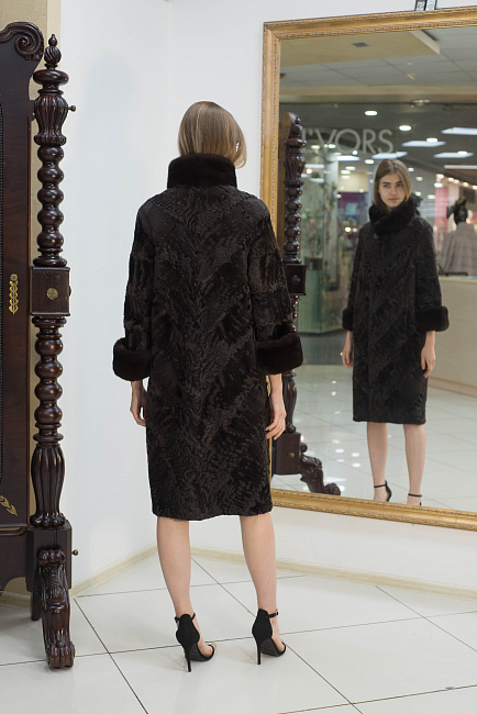 Пальто из каракуля, воротник стойка из меха норки, рукав втачной, отделан мехом норки, силуэт прямой.
