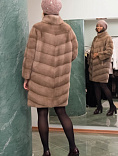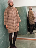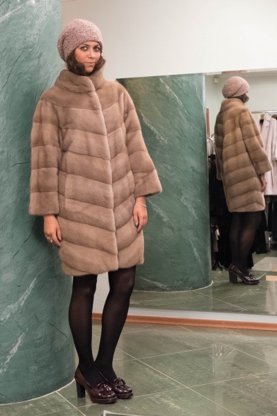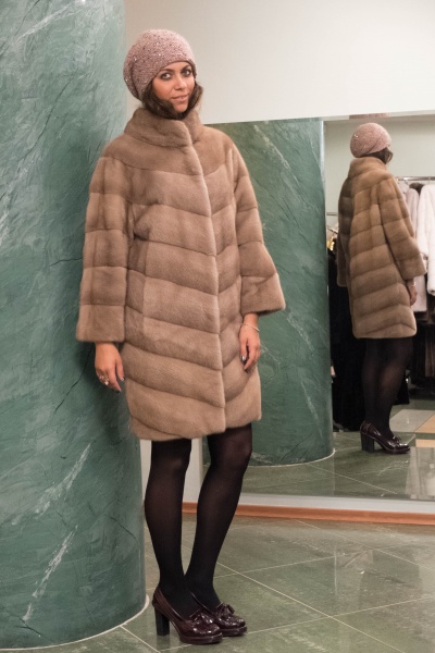 Популярная модель норковой шубки- поперечная диагональная.Это выгодно отличает ее от обычной шубы,так как она прекрасно держит форму и выглядит более стильно и роскошно.Пастельный бежевый оттенок подчеркивает натуральность меха.