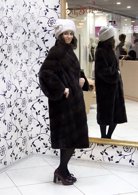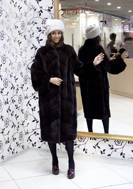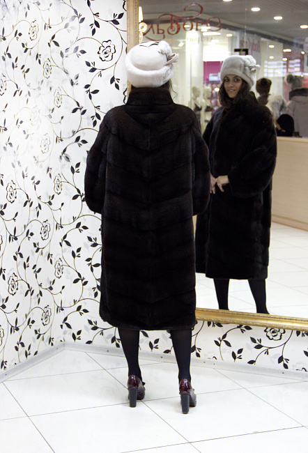 Элегантно и благородно смотрится пальто из норки глубокого темно-шоколадного цвета. Благодаря отсутствию ворота, Вы сможете смело экспериментировать с различными аксессуарами, шарфами и палантинами, меховыми горжетками, тем самым каждый раз меняя свой образ.