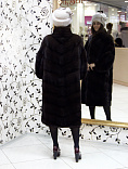 Пальто из меха норки, без воротника, рукав втачной, силуэт прямой, V-образная раскладка меха.