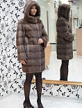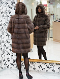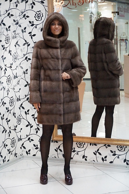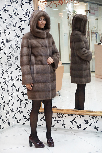 Полупальто из меха норки с капюшоном, силуэт прямой, поперечная раскладка меха.