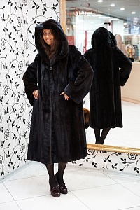 Воротник отложной из меха куницы, рукав втачной, силуэт прямой, меховой пояс.