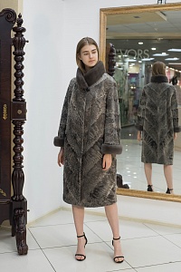 Пальто из каракуля, воротник стойка из меха норки, рукав втачной, отделан мехом норки, силуэт прямой.