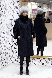 Пальто из астрагана с отложным воротником из меха енота, рукав втачной, силуэт приталенный.