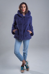 Куртка из меха норки с капюшоном, поперечная раскладка меха, силуэт прямой.