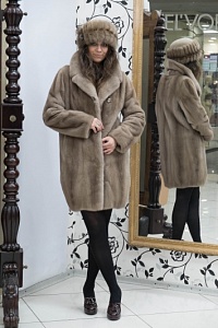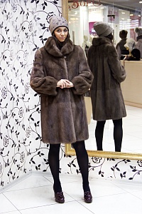 Полупальто из пластин меха норки, воротник стойка, рукав втачной, силуэт трапеция.