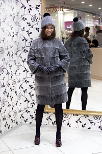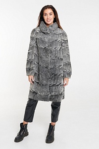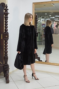 Пальто из меха каракуля без воротника, рукав втачной укороченный, силуэт прямой, поперечная раскладка меха.