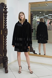 Пальто из меха норки, воротник отложной, рукав втачной, силуэт прямой.