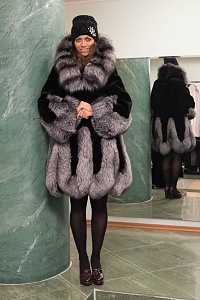 Пальто из стриженного меха бобра, рукав втачной. Шалевый воротник, низ изделия и рукавов отделаны мехом серебристо-черной лисы.